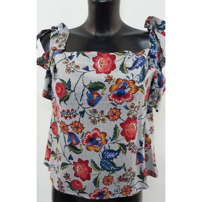Description: floral or polka dots printed top with tie straps and off-the-shoulder neckline