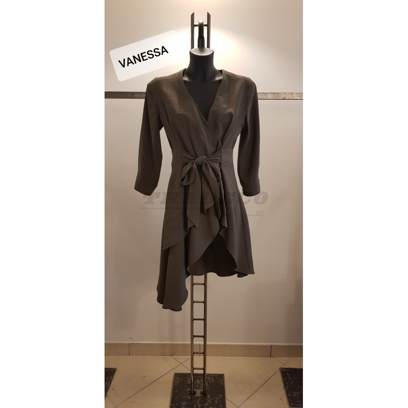 Description: V-neckline dress with bow at the waist, asymmetric and flounced at the bottom