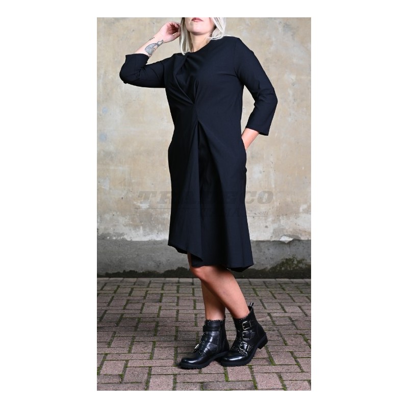 Description: three quarter sleeves, long dress with flounce on the front