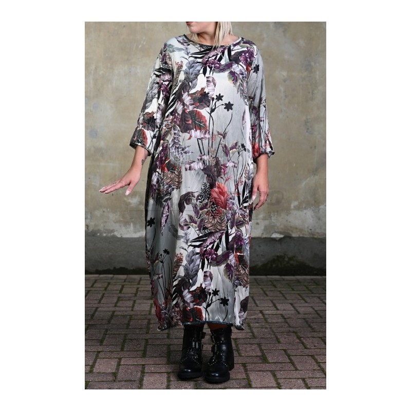 Description: three quarter sleeves, long dress with band with bow at the waist and floral pattern