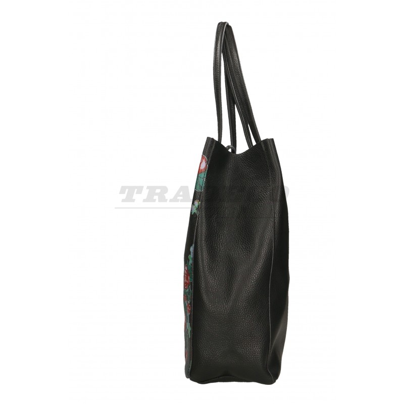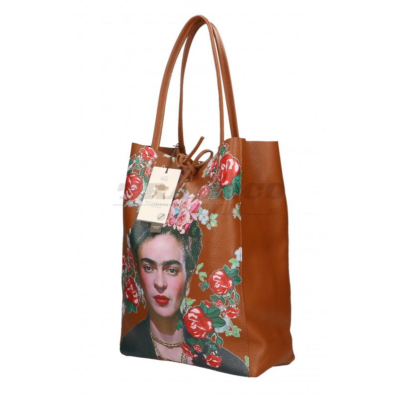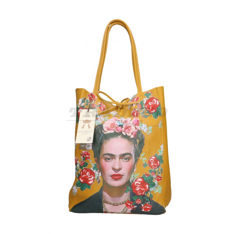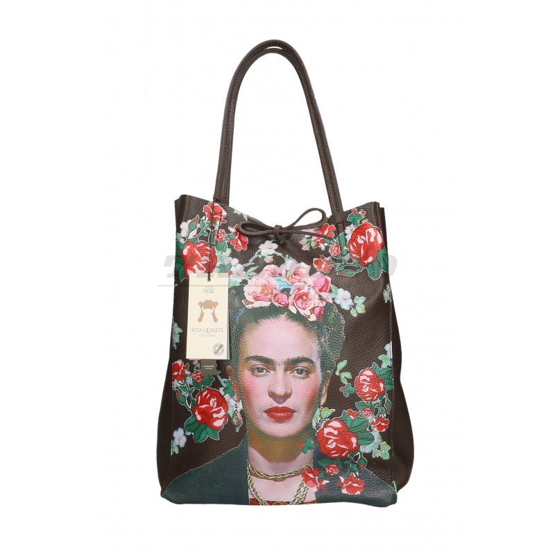 Description: big leather bag with Frida Kahlo print and closure with bow