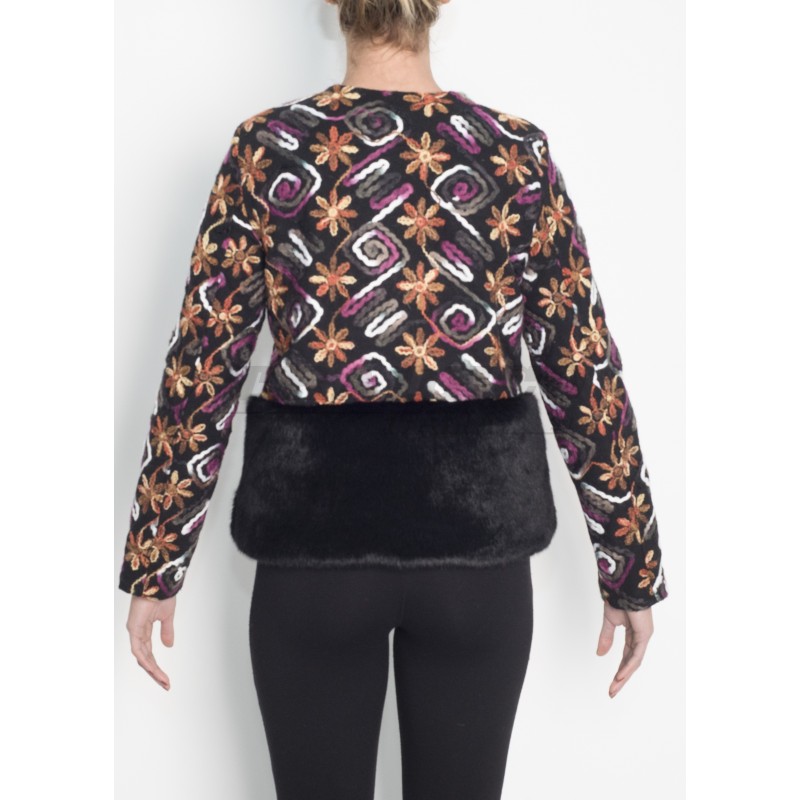 Description: long sleeve printed jacket with faux fur