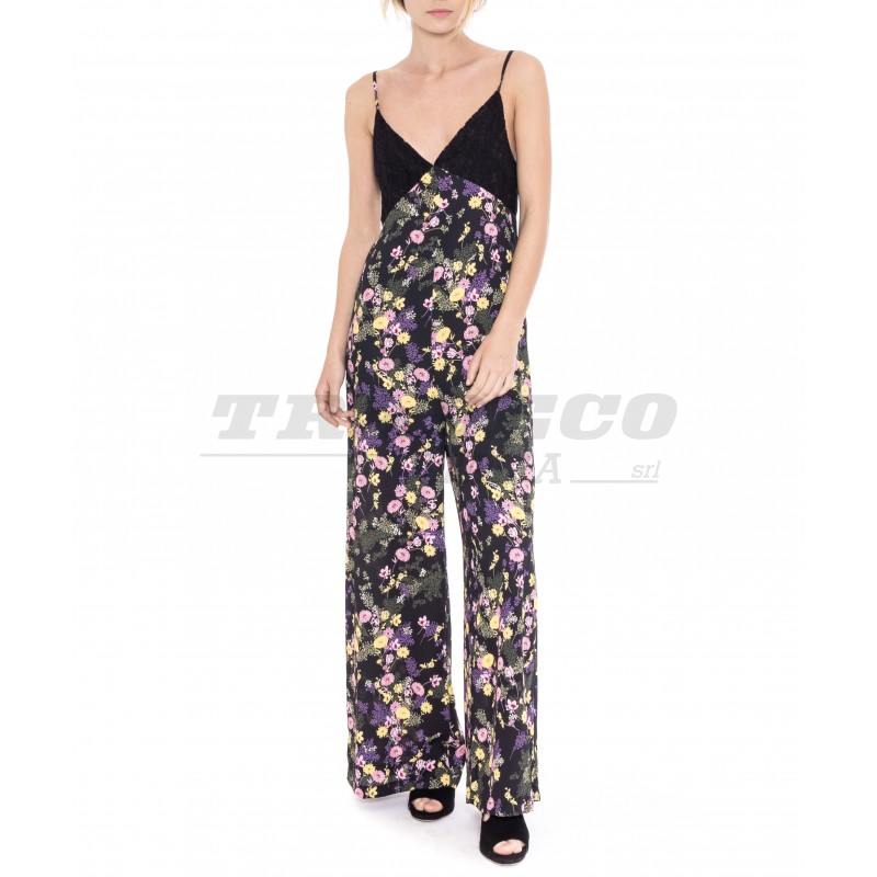 Description: spaghetti strap neckline jumpsuit with lace and floral print