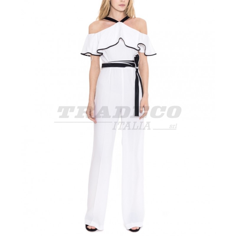 Description: off-the-shoulder flounced jumpsuit with short sleeves