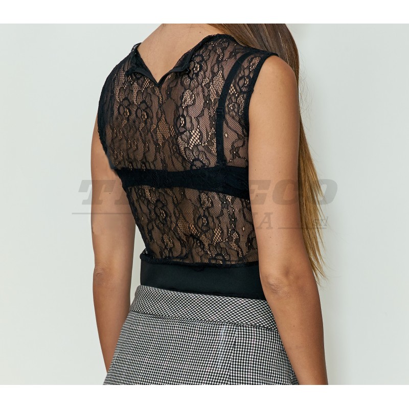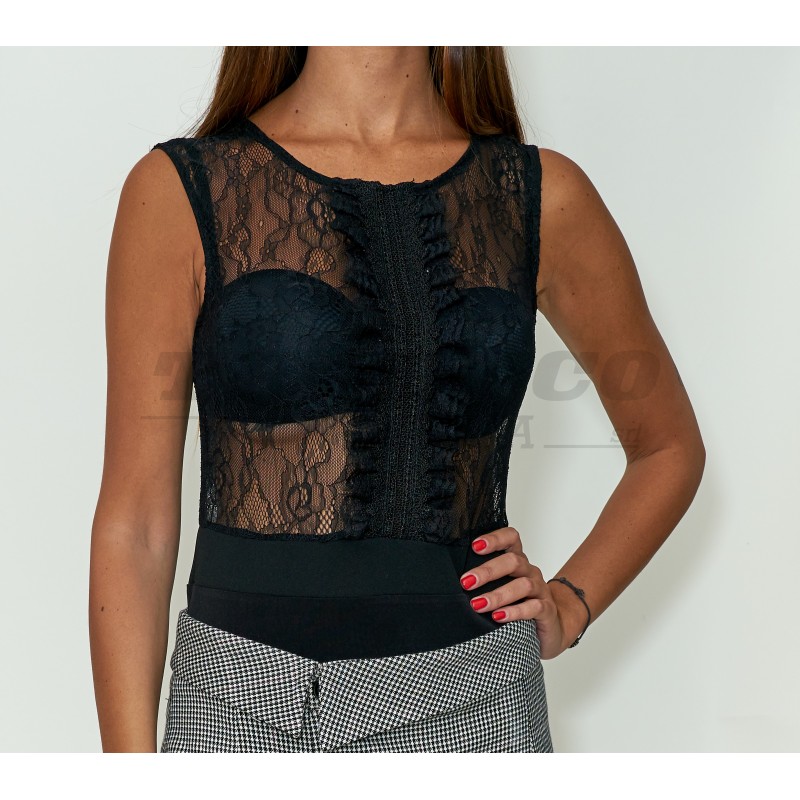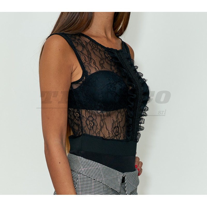 Description: sleeveless transparent lace bodysuit with ruffle detail down the centre
