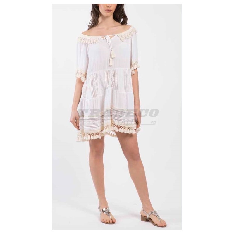 Description: off-shoulder neckline embroidered short dress with lace and short sleeves