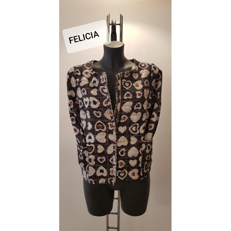 Descripción: chaqueta de mujer con cierre de cremallera escondidos, con decoración de corazones y dos bolsillos laterales